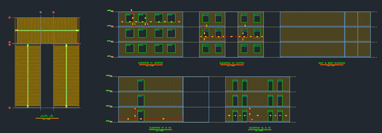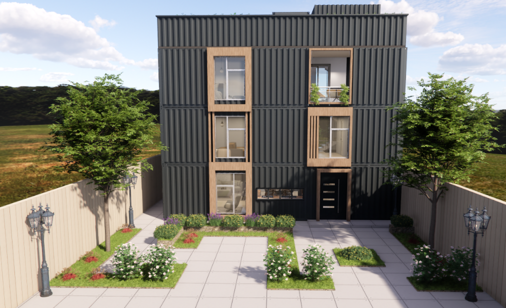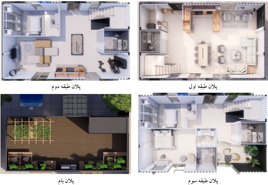 پس از انجام بررسیهای اولیه، از هر دو رویکرد مدلسازی میکرو و ماکرو برای تحلیل رفتار کانتینر استفاده شده است؛ بهطوریکه مدلهای میکرو به منظور بررسی دقیق رفتار، شناسایی نقاط ضعف و مودهای خرابی نمونه بهکار رفتهاند، در حالی که مدلسازی ماکرو برای تحلیل رفتار کلی و طراحی یک نمونه ساختمانی مورد استفاده قرار گرفته است. برای مدلسازی میکرو از نرمافزار LS-DYNA و برای مدلسازی ماکرو از نرمافزار ETABS استفاده شده است. پس از اطمینان از صحت عملکرد مدل ماکرو در مقایسه با مدل میکرو، فرآیند مدلسازی کل ویلای سهطبقه، شامل سه کانتینر در هر طبقه (در مجموع ۹ کانتینر)، در نرمافزار ETABS انجام گرفت. نما و پلان این ویلا در شکلهای زیر قابل مشاهده است.