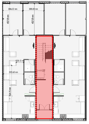 شرکت بام ایدهآل آفرینش در ادامه مسیر نوآورانه خود، گامی فراتر برداشته و پروژهای متمایز با طراحی یک ساختمان سهطبقه با پلان U شکل، متشکل از ۶ کانتینر در هر طبقه (در مجموع ۱۸ کانتینر)، ارائه کرده است. در این پروژه، پلان معماری بهگونهای طراحی شده که تمامی تأسیسات مکانیکی، مسیر راهپله و آسانسور از قسمت میانی سازه عبور کنند (قسمت هاشورخورده در شکل زیر). این رویکرد هوشمندانه نه تنها کارایی فضا را بهبود بخشیده، بلکه امکان جداسازی سازه و بهرهبرداری مجدد از کانتینرها را با سهولت و حداقل آسیبدیدگی فراهم میآورد؛ بهگونهای که امکان بهرهبرداری از کانتینرها در پروژههای دیگر فراهم میشود. با این حال، این پروژه با چالشهای ویژهای در حوزه طراحی لرزهای روبهرو است که نیاز به تدابیر فنی خاصی را ایجاب میکند. از جمله مهمترین چالشها، نامتقارنی ذاتی پلان U شکل و تأثیرات نامطلوب آن بر عملکرد لرزهای سازه بود. در چنین پلانهایی، توزیع نامتوازن جرم و سختی میتواند موجب تمرکز نیروها، افزایش پیچش و بروز تغییرمکانهای نامتقارن در حین زلزله شود. این موضوع، بهویژه در ساختمانهای کانتینری که به دلیل محدودیتهای ذاتی در ابعاد مقاطع قابی و اتصال تیر-ستون اهمیت بیشتری پیدا میکند.